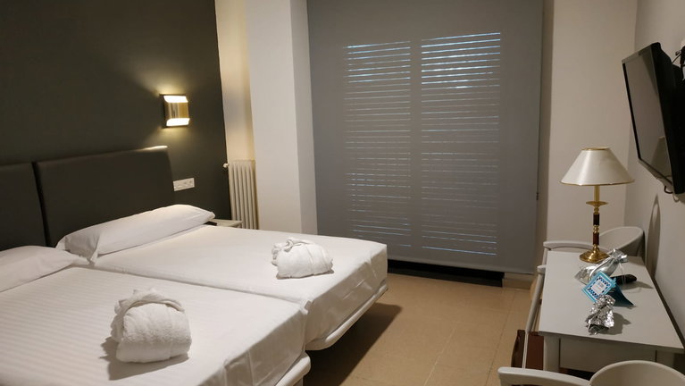 Habitación doble estandar con baño, equipada con nevera, televisión y secador de pelo.